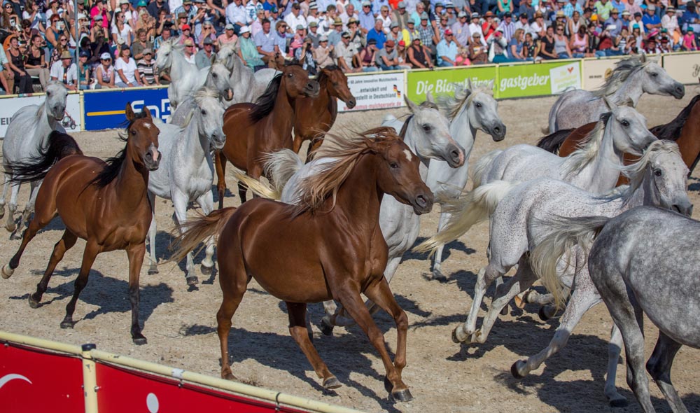Das Haupt- und Landgestüt Marbach lädt ein, das lebendige Kulturgut zu entdecken, so z. B. bei den alljährlichen Hengstparaden, bei denen auch die Araberstutenherde dem Publikum präsentiert wird. Foto: Oliver Seitz