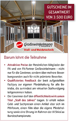 Der Titel „Stall des Jahres 2026″ wird Ende August im Rahmen der Al Shira’aa Bundeschampionate in Warendorf feierlich verliehen. Die Auszeichnung ist Höhepunkt für den Gewinnerbetrieb, mit attraktiven Gewinnen verbunden und Inspiration für andere.