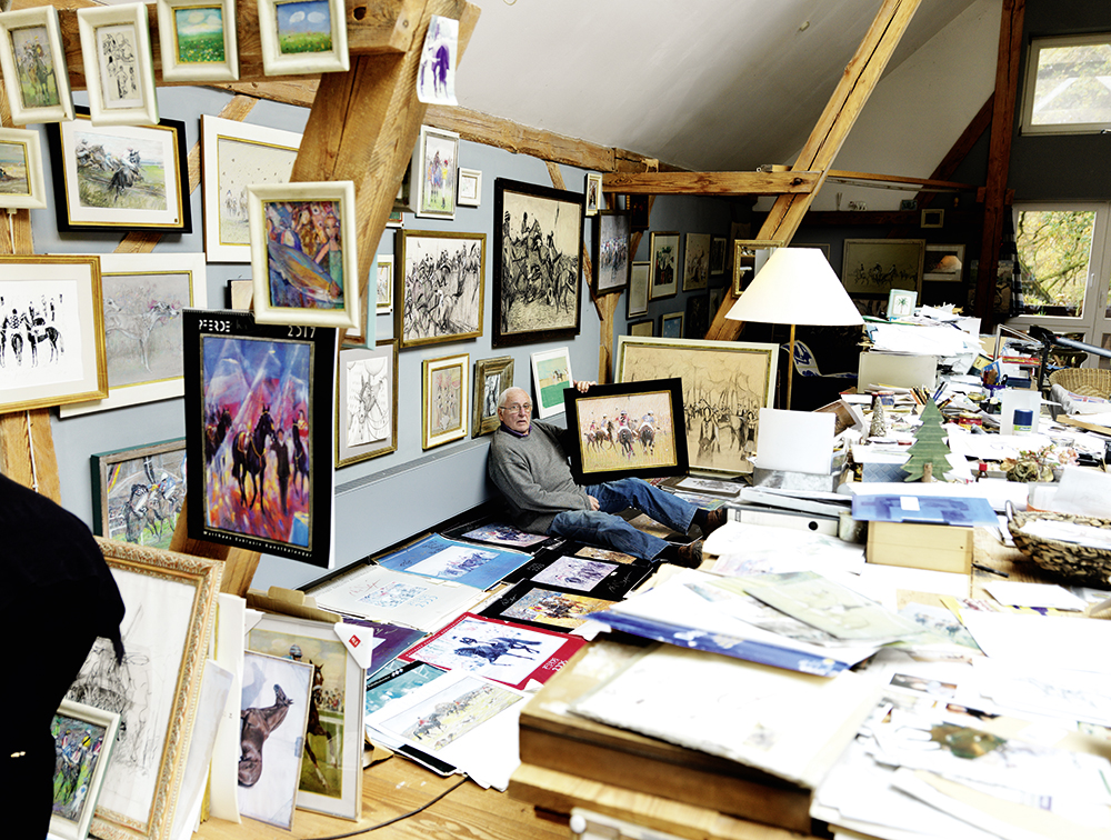 Durch die bodentiefen Fenster und Dachluken des Ateliers fällt die Frühlingssonne. Sie taucht den Raum in ein warmes Licht. Der Blick an die Decke offenbart offenes Gebälk. Die Holzdielen lassen den Gang hier und da knarzen. Gemälde, Bilder, Skizzen, Zeichnungen und Bleistiftstudien beherrschen jedes noch so kleine Fleckchen. Sie hängen, lehnen, liegen und stapeln sich überall – an der Wand, an den Holzbalken, auf dem Boden, an Bücherregalen, zwischen verstaubten Flaschen, auf den Tischen. Förmlich zu spüren ist der kraftvolle Galopp der Pferde auf der Rennbahn, wie der Boden unter ihren Hufen bebt, wie sie ihre Muskeln anspannen und ihre letzte Kraft ins Finish legen. Der gleichmäßige Rhythmus des lauten Atems durch ihre geblähten Nüstern hallt in den Ohren nach. Drahtige Vollblüter. Schlanke Silhouetten. Im Rausch der Geschwindigkeit. Klaus Philipps Bilder strotzen nur so vor Energie und Dynamik. Und dabei geben sie wieder, was den Pferdesport so einzigartig macht: das Zusammenspiel zwischen Reiter und Pferd. „Mich interessiert erfolgreiches Reiten nur, wenn es in gutem Stil geschieht“, so Klaus Philipp, der Maler, der aber vielmehr noch Reiter und Pferdemensch ist. Er bringt auf die Leinwand, was er erlebt. Er malt, was er wahrnimmt. Und vielmehr gibt er wieder, was er selbst im Sattel gespürt hat.