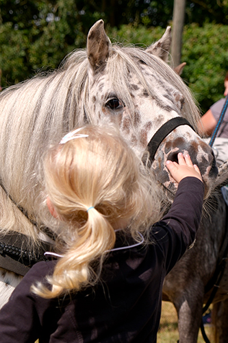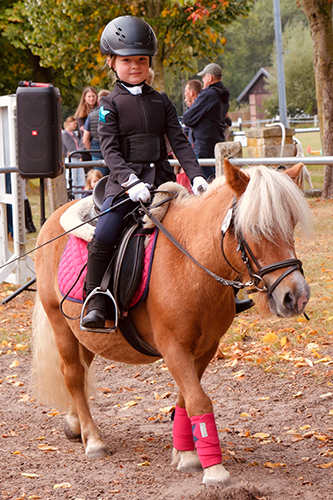 Der Dörenther Shetty-Sporttag ist nicht der einzige in Deutschland: „Shetty Sport Süd“ ist ein Veranstaltungsreigen mit Turnieren an unterschiedlichen Orten – treibende Kraft ist der Ponyhof Müller in Denkendorf bei Stuttgart. Einmal im Jahr findet auf dem Landgestüt Redefin ein Shetlandponytag statt. Viele Termine mehr präsentiert die Interessengemeinschaft der Shetlandponys e.V. auf ihrer Homepage (ig-shetland.de). Am Anhängerparkplatz stehen die Ponys neben nahezu gleichgroßen Heunetzen, andere grasen in abgesteckten Weiden. Auf dem Reitplatz tragen die Shettys Glitzerstirnband und Bandagen in passender Farbe zur Schabracke. Konzertiert trabt die siebenjährige Hanna Wißing mit Shetlandpony Tweety, ein Professor-Pony und Lehrmeister Ü20. Mit Shetlandponys haben manche Spitzensportreiter angefangen. Hannas Mutter ist nicht ganz so ruhig: „Es ist das erste Mal, dass Hanna allein in einem Wettbewerb galoppiert.“ Ob aus dem Turniersport oder ganz ohne Pferdeerfahrung – alle Eltern sehen:Die Kinder haben Spaß, wachsen an Selbständigkeit, bauen Vertrauen zum Pferd auf und von der Größe passt es einfach gut mit den Shetlandponys. Die Siegerehrung des Reitwettbewerbs hat dank des von Monika Langelager selbst gebauten Treppenpodests Olympia- Niveau, die Sieger-Schärpen im Vorführwettbewerb sind Schwarz-Rot-Gold und tragen den Schriftzug „Shetty of Dörenthe“. Mindestens 40 Paar Hände klatschen. Die Erwachsenen präsentieren ihre Shetty an der Hand oder vor der Kutsche und haben mindestens ebenso viel Spaß wie die Kinder. Sabrina Vallentin aus Borken hat ein „Endmaßminishetty“ Barny (86 Zentimeter „klein, süß – aber die haben viel Pfeffer“). Wie Lara Jane Pracht kam sie auf die Ponys, weil sie Gesellschaft für ihren Großpferderentner suchte. „Mein Warmblut ist eine Drama-Queen, aber die Shettys machen einfach alles mit – gehen sogar angespannt, wenn ich Inliner fahre“, sagt Lara Jane Pracht. Manuela Hess, Reitsportfachhändlerin mit Shetty-Spezialisierung und einem Stand in Dörenthe, warnt: „Wer ein Shetty nur als Beistellpony hält, darf nicht glauben, dass es günstig ist. Sie sind fast genauso teuer wie große Pferde. Und als Rasenmäher sind sie nicht geeignet und viel zu schade – Shettys wollen beschäftigt werden. Sie lernen unglaublich schnell: Die schauen dreimal zu, wie das Tor aufgeht – und beim vierten Mal öffnen sie es selbst.“