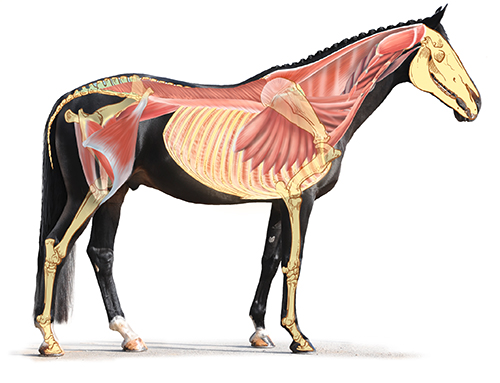 Warum gerade die Oberlinie anfällig fürs Absacken ist, liegt auf der Hand. Zum einen ist ein Pferd ein Vierfüßler, bei dem der gesamte Rumpf mit all seinen darin liegenden Organen zwischen Vor- und Hinterhand aufgehängt ist. Hier zieht allein schon die Schwerkraft dieses Gewicht nach unten. Im hinteren Bereich des Rumpfes sind die letzten Rippen frei, das heißt, sie sind nicht mit dem Brustbein verbunden, so dass hier in erster Linie die Bauchmuskulatur die untere Stütze für das Gewicht der Eingeweide leistet. Der vordere Rumpfbereich, in dem sich Herz und Lunge befinden, ist zwar über die echten, mit dem Brustbein verwachsenen Rippen geschützt und auch abgestützt. Aber es gibt hier, im Gegensatz zur menschlichen Anatomie, keine knöcherne Verbindung, kein Schlüsselbein, zwischen Rumpf und Schulterblättern, das Stabilität bringt, sondern lediglich eine bindegewebige Aufhängung aus Muskeln und Bändern, ähnlich einer Schlinge.